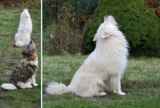 Ja, meine Fans, mein Freund Sami, der wusste sich zu Benehmen in einem Restaurant. Er mimte den Teppich für die Kellner, doch da er so ein schönes weiches, weißes Fell hatte gingen alle ganz vorsichtig um ihn herum. Er signalisierten mir, wo es etwas zu schauen gab. Unter den Tischen war es besonders spannend. Ich sage euch, diese Beine der Zweibeiner verraten doch einiges über die Menschen und die Schuhe waren voller toller Düfte, nur für unsere Hundenasen. Ich nahm alle Tipps mit wahrer Freude auf und wurde müder und müder. Tage später kam es dann zu meinem bisher eindrucksvollsten Erlebnis. Mein Freund Samweis organisierte ein Treffen im Wolfspark in Merzig für mich. Ein echt tierisches Erlebnis. Und so viele Elos habe ich getroffen und dann noch viele, viele andere Hunde und noch Neele von der kleinen Oase, meine Großcousine, wie wir jetzt wissen. Natürlich auch die Wölfe, doch die interessierten mich nicht so sehr.